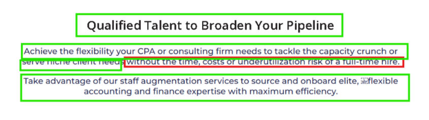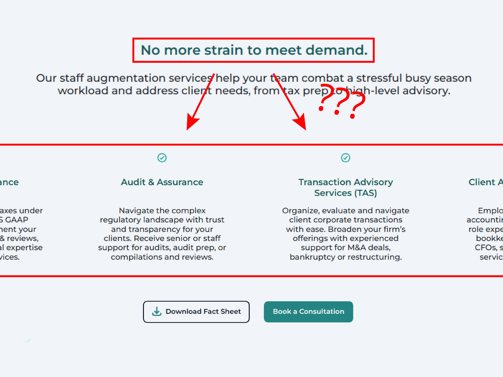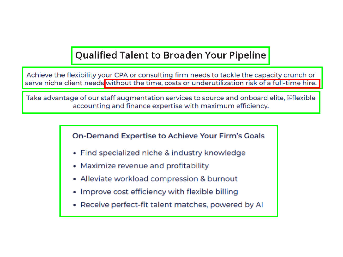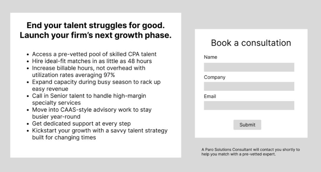 To a small CPA firm, adding staff is scary. That makes unanswered questions extra dangerous: leave cracks in our case, and fear will seep in.Existing "minimum viable" page.