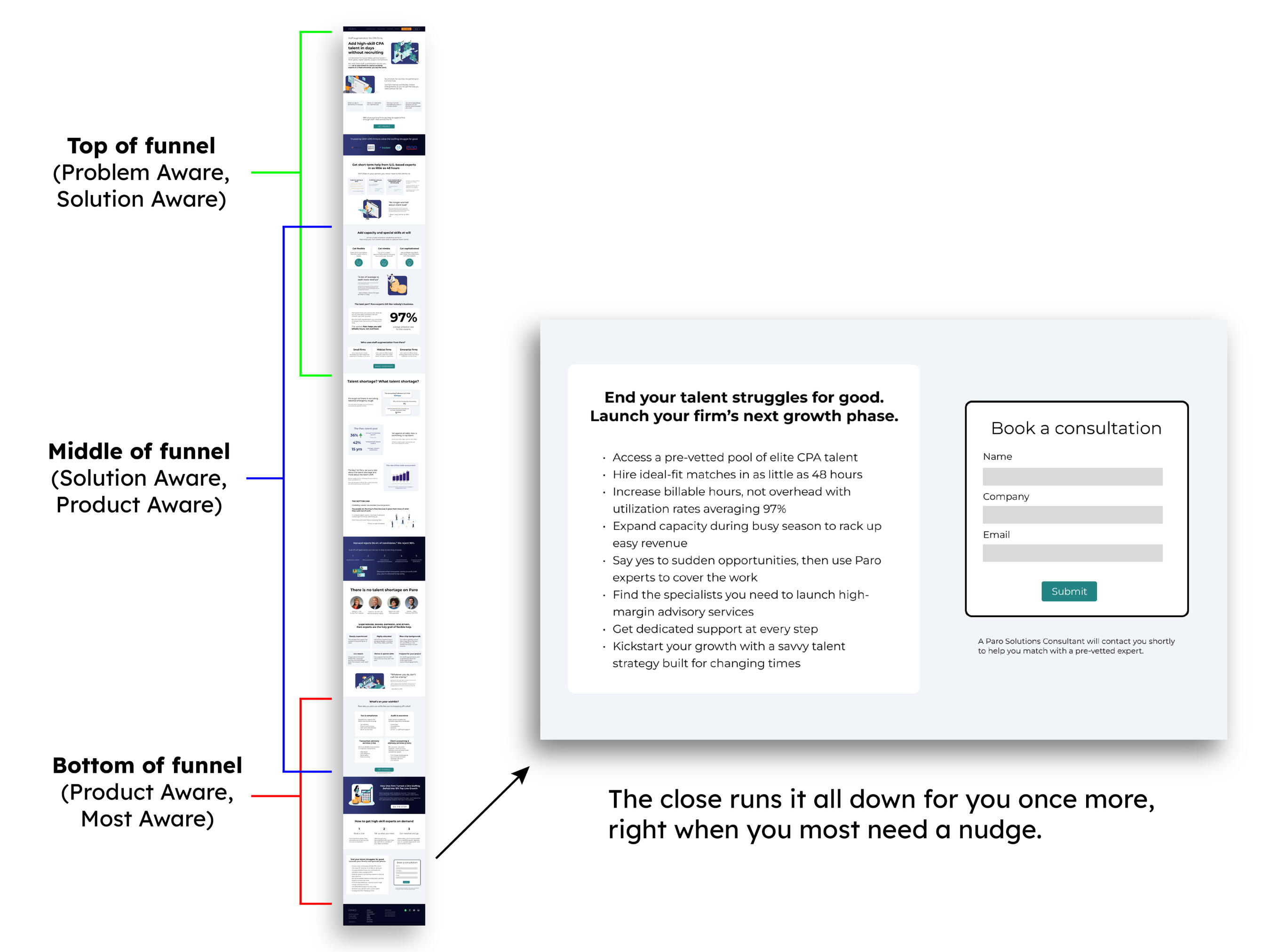 1) Multiple use cases. Staff aug is a handy tool for small, midsize, and large firms—but all for different reasons.2) High stakes. Adding staff is so scary that a few unanswered questions could doom the whole offer.3) Existing “minimum viable” page. We couldn’t get hung up on the hasty message we had. This page needed a teardown, not a tweak.