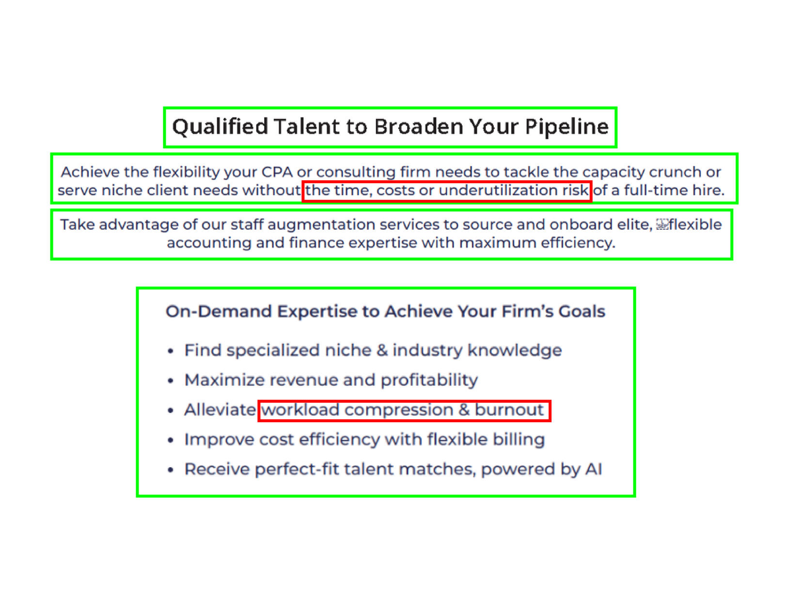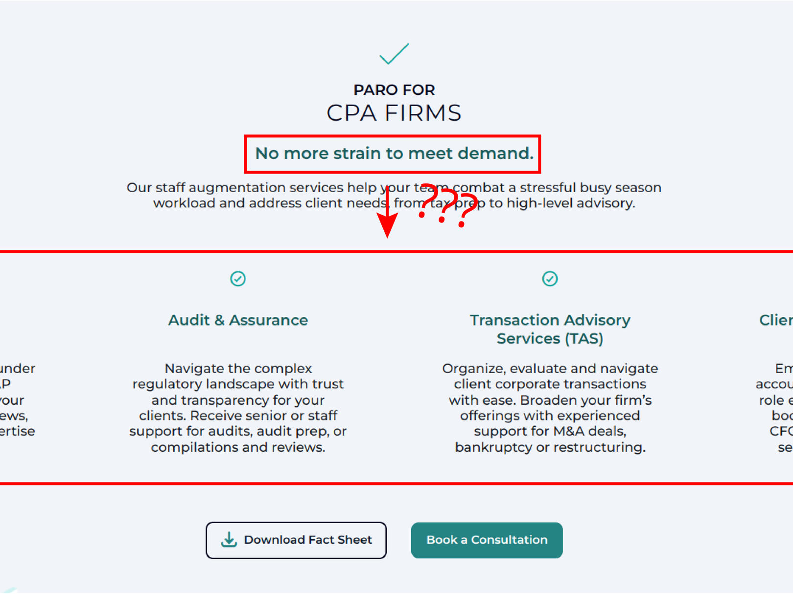 To a small CPA firm, adding staff is scary. That makes unanswered questions extra dangerous: leave cracks in our case, and fear will seep in.Existing "minimum viable" page.