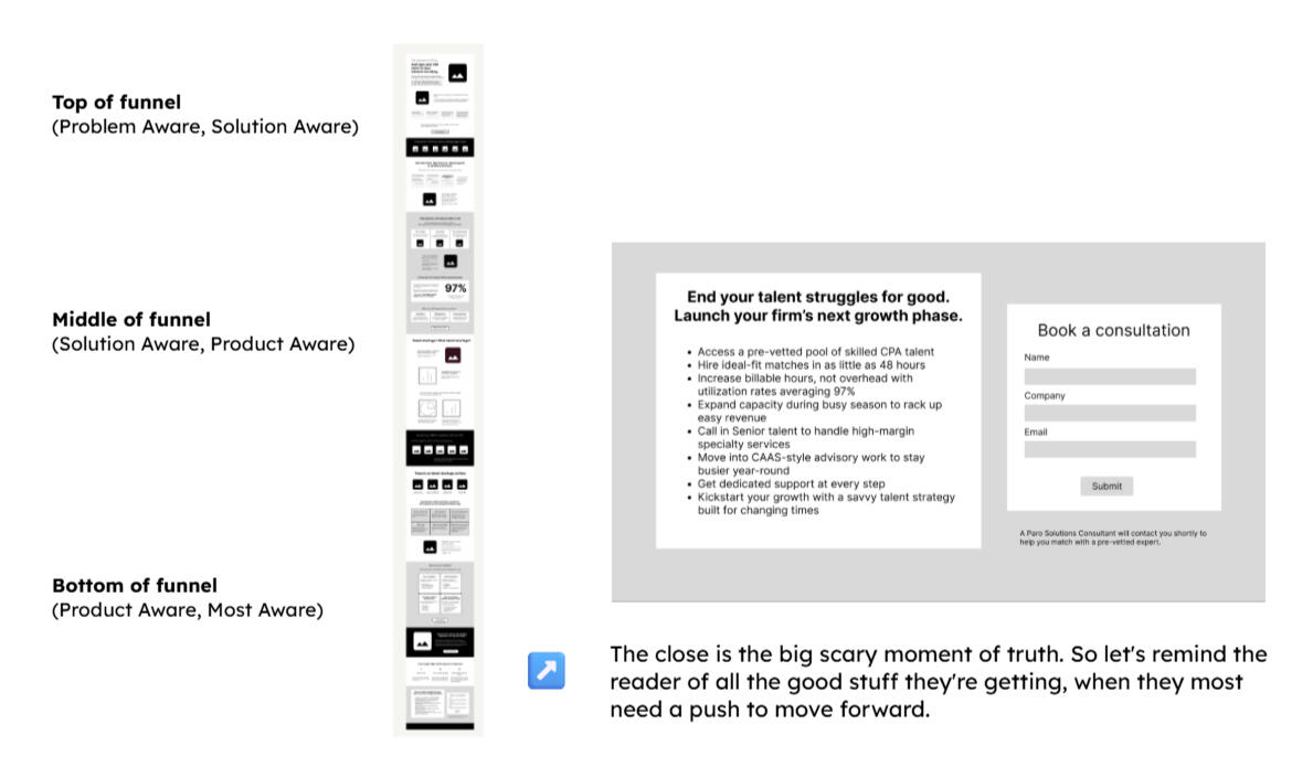 Restructure the page to move readers through the “stages of awareness.” Then close with a strong call to action that sums it all up.